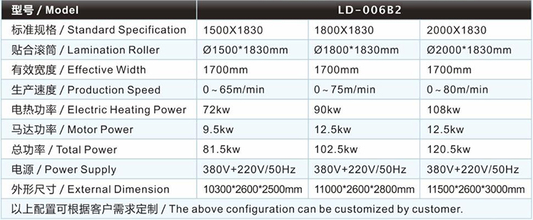 | 水胶复合机/贴合机-立式双轮单网单槽水胶高速泡棉复合机/贴合机LD-006B2的主要技术参数 / Major technical parameters |
